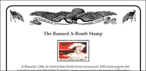 The "A-bomb Replica Stamp Presentation" PageWith the A-bomb Replica stamp and a complete description of the circumstances behind the banning of the U.S. A-bomb stamp and the creation of the A-bomb Replica Stamp. |