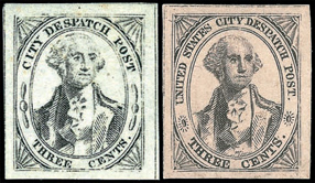 ![]() Left, Sc. 40L1, Greig’s City Despatch Post first stamp, issued Feb. 1, 1842; right, Sc. 6LB3, “the First U.S. Postage Stamp”, same design as Greig’s, but with “United States” added, different ornaments, and on a shade of rose paper, issued Sept. 1, 1842. |