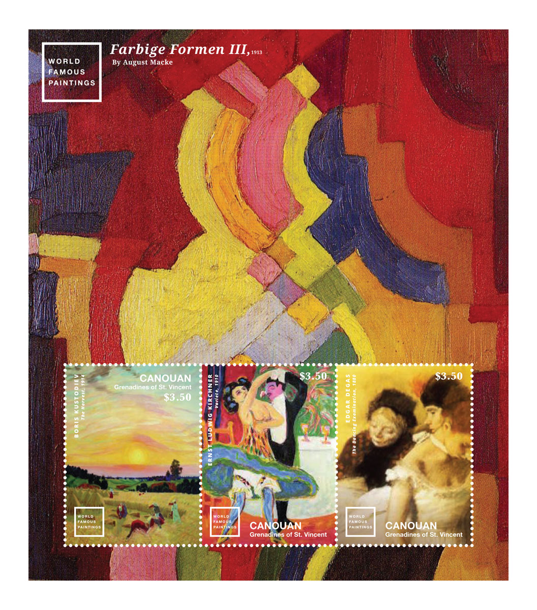 Famous Paintings Set Released December 31 Just as the year 2015 came to an end, word came in from the Inter-Governmental Philatelic Corporation that a group of nations they represent issued a Famous Paintings mini-Omnibus set. Shown here (see attached PDF below), top left is "Water Lillies" by Claude Monet, issued by the Canouan Grenadines of Saint Vincent. In the 1890s, as part of a landscaping project, Monet developed some lily ponds that included plants from distant lands. In a variety of forms and colors, they became the subjects of his bestknown paintings. At the lower right, and in color on our front cover, is “Farbige Formen III” by August . . . Continue reading "Famous Paintings Set Released December 31" [PDF Document] |