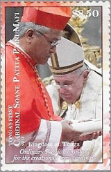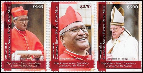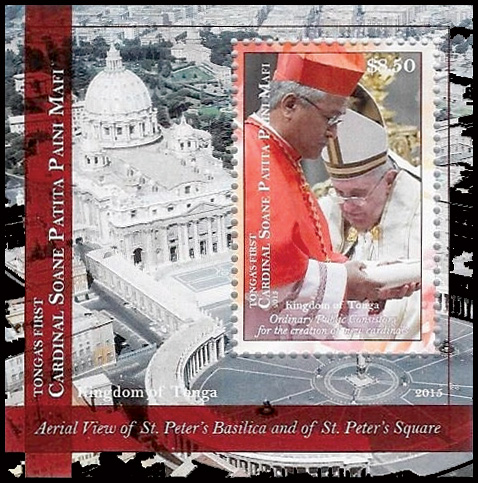 Tonga The Kingdom of Tonga is made up of 177 islands scattered over 270,000 square miles in the southern Pacific Ocean. Its population of just over 100,000 people live on 52 of those islands, with some 70,000 Tongans residing on the main island of Tongatapu. Also known as the Friendly Islands because of the friendly reception Captain James Cook received in 1773, Tonga also has won friends among postage stamp collectors for its often humorous, always interesting, new issues. Tonga Celebrates the First Tongan Catholic Cardinal Cardinal Mafi — On April 1, 2015, the Kingdom of Tonga in the South Pacific celebrated the appointment of the Polynesian nation's first Cardinal. Soane Patita Paini Mafi, appointed by Pope Francis on February 14, 2015, not only became the first Cardinal from Tonga but also, as Cardinal Mafi, at 53, became the youngest member of the College of Cardinals. |