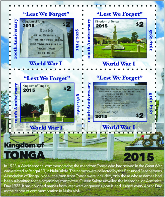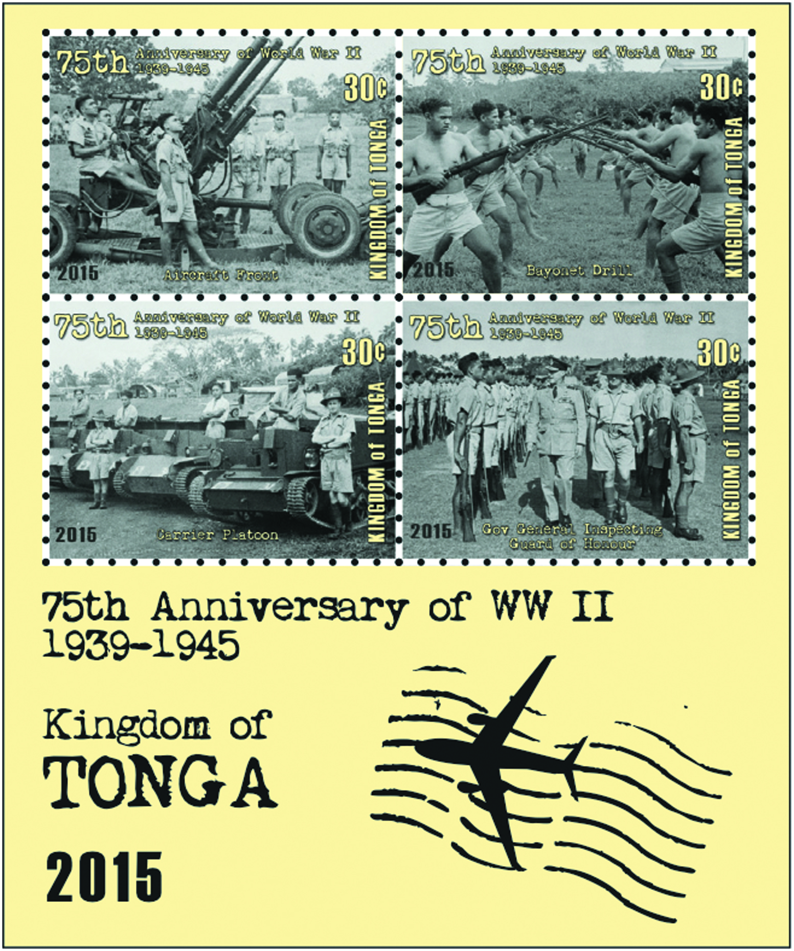 Tonga Honors WWI & WWII Soldiers On February 2 the Kingdom of Tonga joined the many nations who have commemorated the 100th Anniversary of World War I and the 75th Anniversary of World War II. The WW I issue depicts the War Memorial that stands at Pangai Si`i, in Nuku`alofa (Tonga). The WW II issue utilizes archive photographs of soldiers during the various aspects of training in Tonga. In 1923 the War Memorial commemorating the men from Tonga who had served in the Great War was erected. The names were collected by the Returned Servicemens Association of Tonga. . . . Continue reading Tonga Honors WWI & WWII Soldiers [PDF Document] |