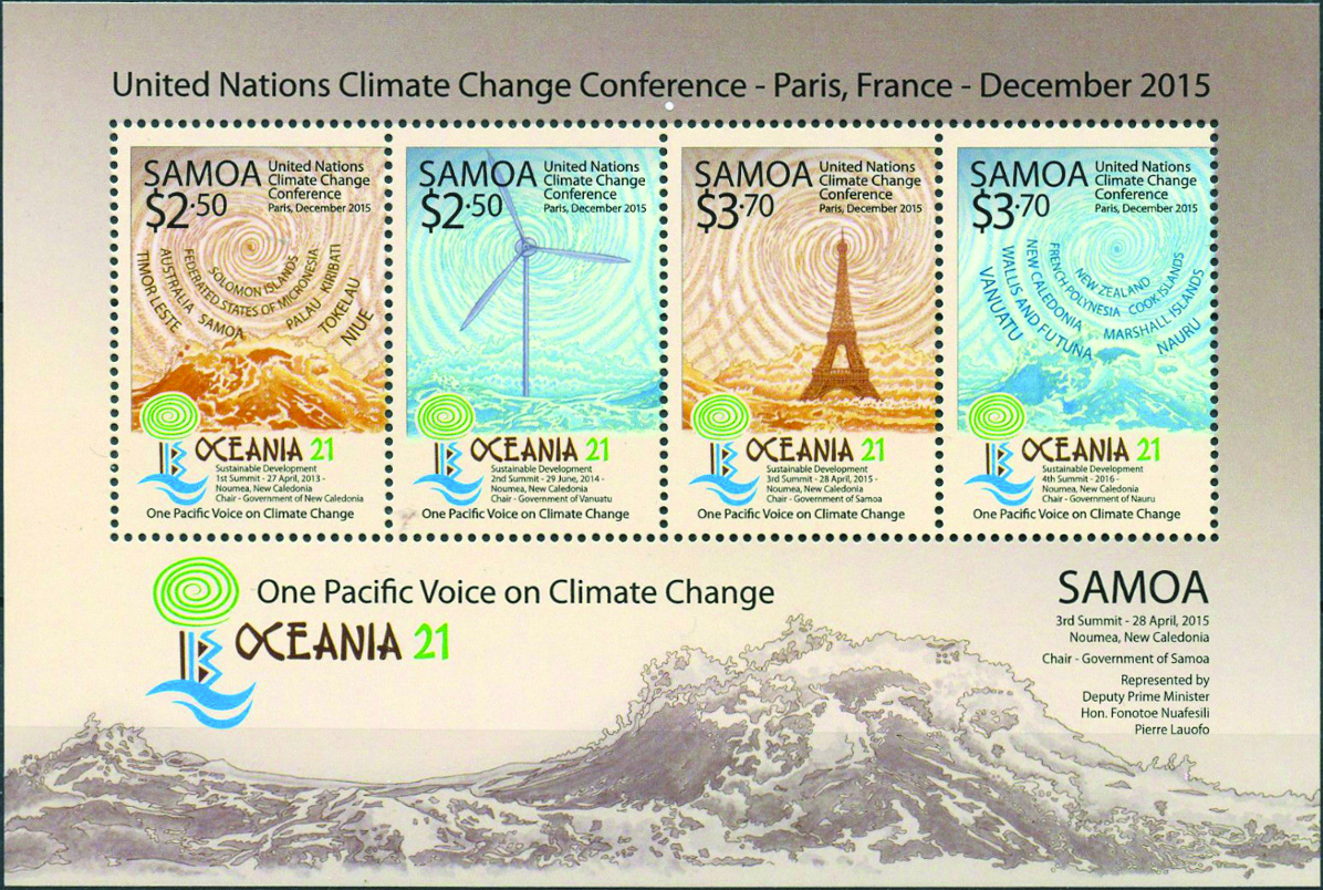 Samoa Chairs, Commemorates Climate Confab Last November 3 the Pacific Island nation of Samoa issued a set of four singles and a souvenir sheet using the same designs to commemorate the 2015 Oceania 21 climate control conference that was held April 28-30 in New Caledonia. Samoa was responsible for holding the Chair position at that Summit, which resulted in the Lifou Declaration that calls upon the international community to save Oceania in the face of climate change. . . . Continue reading Samoa Chairs, Commemorates Climate Confab [PDF Document] |