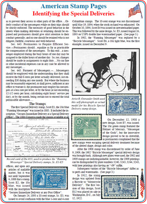 Special Delivery Pages available for purchase Much has been written about the Special Deliveries since the first one was issued in 1885. The set of 23 stamps, Sc. E1-E23 reflects the evolution of the movement of the mails as well as changes in production during the time Special Delivery stamps were issued. We have created a set of pages that covers the "E"s, starting with background information and a brief history of the Special Delivery service. As the early issues also offer identification challenges that do affect their value, we also have created an identification guide to each issue—and we finish the project with pages on which you can mount a set of singles. Click here to access the Special Delivery Pages Order Form [PDF Format]. We also offer many of the Special Delivery Stamps as mint or used singles and as plate blocks. Click here to access that price list, then either print it out and use it to mail in your order or use our Stamp Sales Order Form [PDF Format]. If you have any questions, contact us at [email protected] or call us toll free on our business cell phone number at (603) 424-7556. Thank you. |