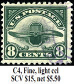 As you browse our list of U. S. Used Stamps, you will see stamps pictured with a number or a number and a letter. In the example shown to your left the first combination of a number and letter is what is referred to as the Scott Number "C4". This identifies the stamp in a Scott Catalogue. After the Scott Number is the condition of the stamp, "Fine". Light ccl indicates a light color cancel. SCV is the Scott Catalogue value, "$15. If you need a little help with the terminology, click for Stamp Condition Terminology from Wikipedia.