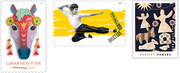 February stamp releases from the USPS for 2026! Lunar New Year Forever Stamp, 1 design; Bruce Lee Forever Stamp, 1 design; Harriet Powers Forever Stamps, 4 designs.