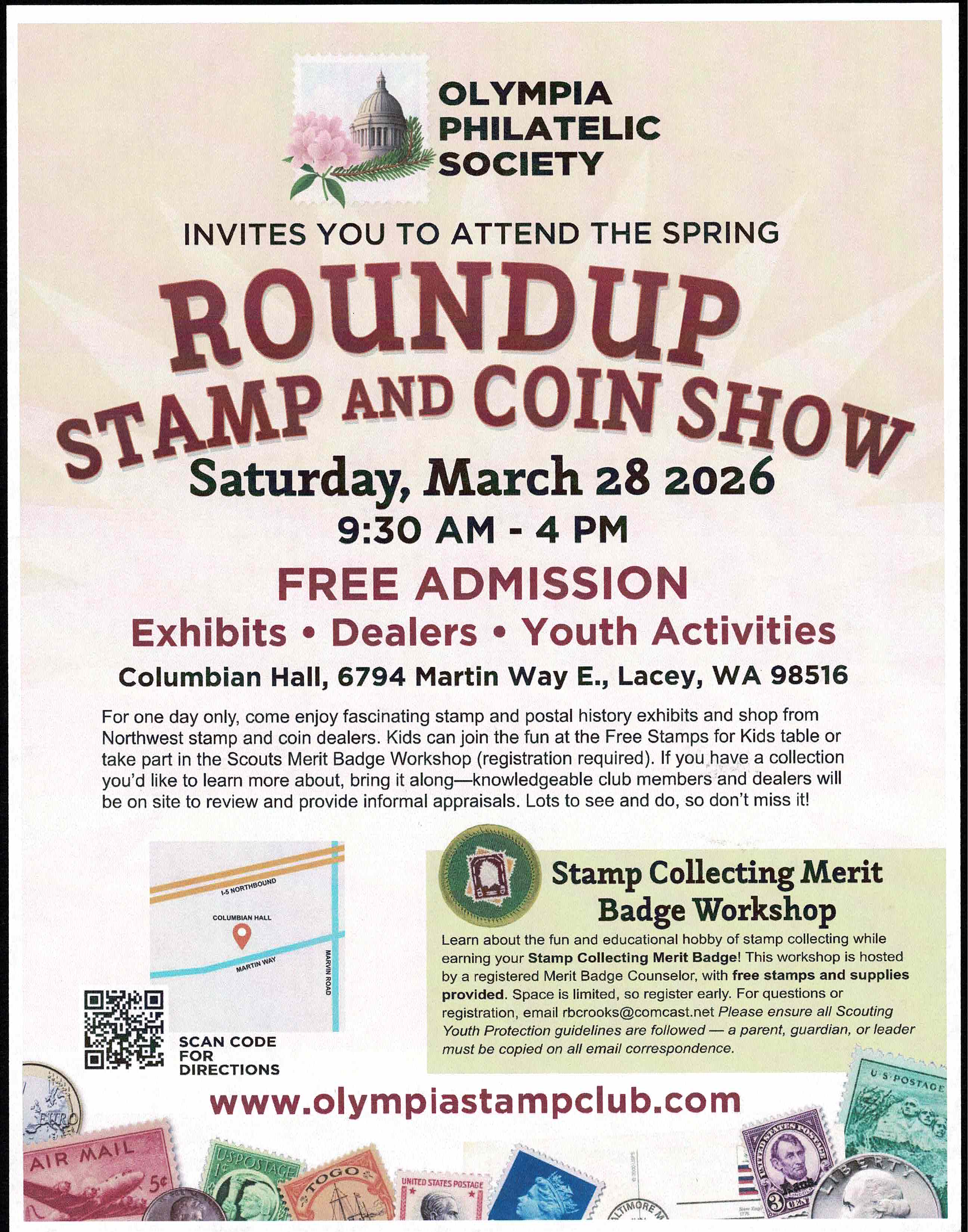 Spring Roundup Stamp & Coin Show, Columbian Hall, 6794 Martin Way E. Exhibits, dealers, youth activities. Sat, 9:30-4. Free.