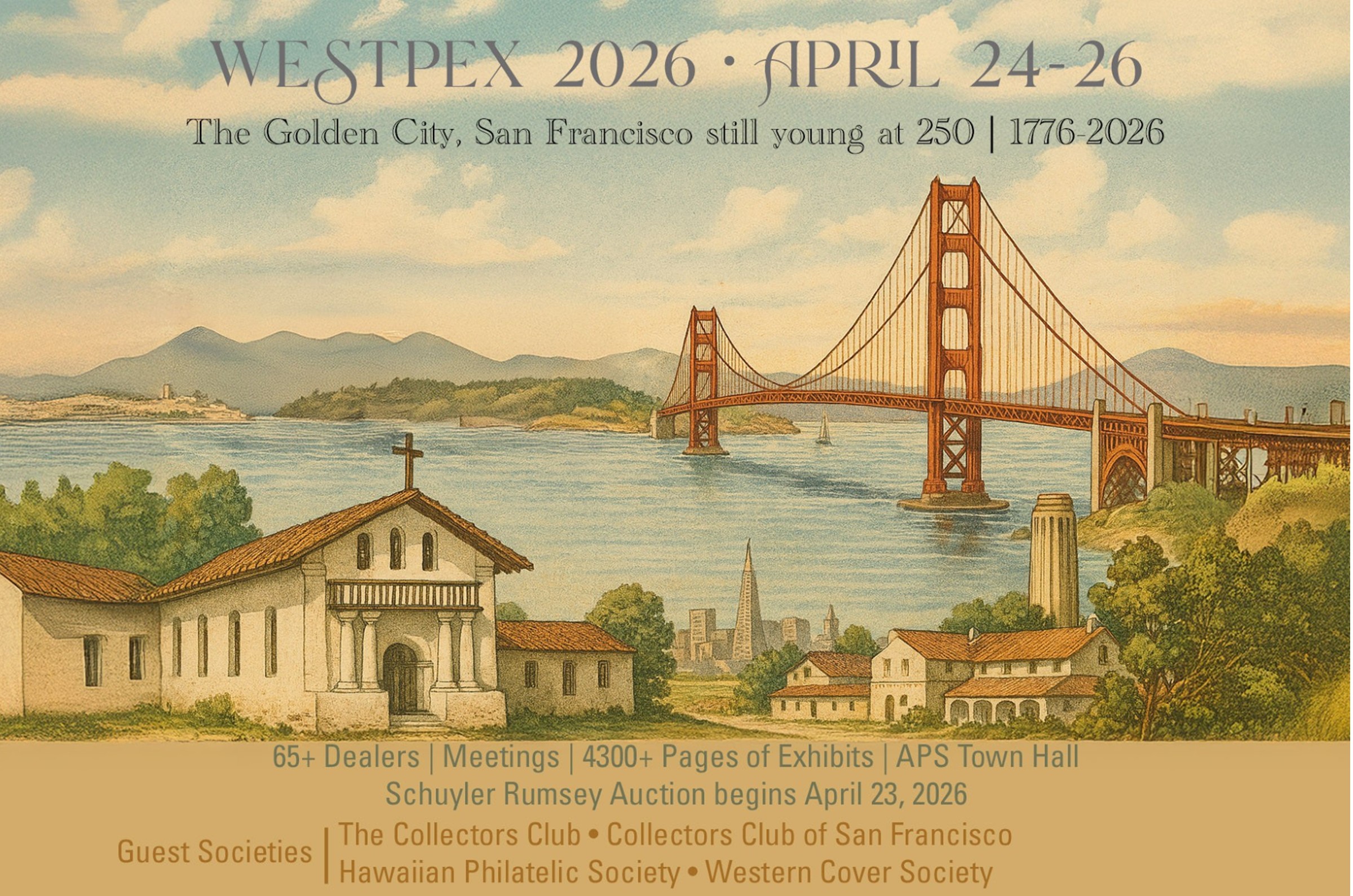 WESTPEX 2026, San Francisco Airport Marriott Waterfront Hotel, 1800 Old Bayshore Hwy. Exhibits, dealers, societies, USPS. Fri & Sat, 10-6; Sun, 10-3. Season pass $5.00; under 15 free with adult. Validated parking.