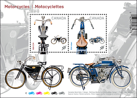 Canadian Motorcycles, [Click to see souvenir sheet] On June 5 Canada Post released the first two Permanent [non-denominated] First Class domestic rate stamps in a set dedicated to Canadian motorcycle manufacturing and design. The two stamps travel back to the turn of the century, when out of the desire to merge the flexibility of bicycles with the speed of cars the first motorcycles were created. The stamps showcase two early models, the CCM 1908 Lightweight Motor Cycle and the 1914 Indian. They are the first in a series dedicated . . . |