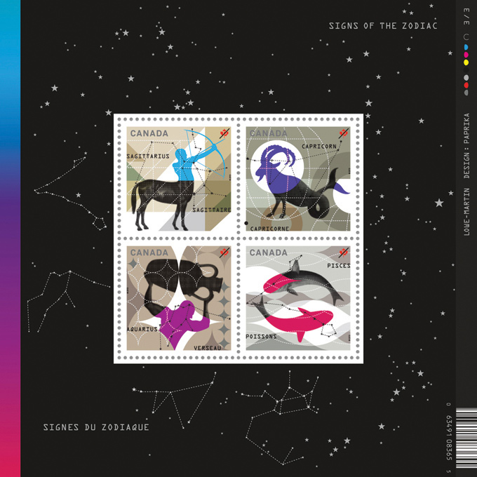 Zodiac Series [Click to see 4 designs] On February 20 Canada Post issued its 2013 Signs of the Zodiac set, the final installment in a three-year series that began with Aries in the Spring of 2011. The stamps, each printed in the vivid colors traditionally associated with their respective sky sign, feature a layering of astrological symbolism and a stylized representation of each constellation. According to Stamp Design Manager Alain Leduc, astrology borrows from myths to explain personality quirks. It made the night sky much less foreboding to our ancient relatives and provided an early means of noting the passing of time and the seasons. It was a way of bringing order to the chaos of the natural and astronomical world. . . . Continue reading "Canada Completes Zodiac Series " [PDF Document] |