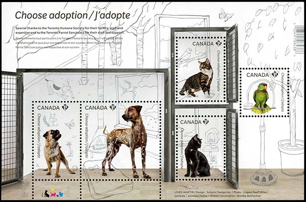 Adopt A Pet , [Click to see souvenir sheet] On April 22 Canada Post released a new five-stamp issue promoting pet adoption from local shelters. Developed in collaboration with the Canadian Federation of Humane Societies (CFHS), the series calls attention to the plight of homeless pets in Canada. In 2010 in Canada, close to 150,000 homeless pets were admitted to shelters. While many were either returned to their owners or placed in new homes, too many remain homeless. The stamps feature two dogs, two cats and a colorful parrot. They showcase real shelter animals, with their. . . . |