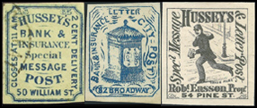 A sampling of Hussey’s designs, left to right: 1865 2¢, Sc. 87L38; 1875 (2¢), Sc. 87L52; 1877 unstated value, Sc. 87L56.