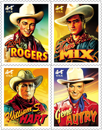 | Apr. 17, 4446-4449–44¢ Cowboys of the Silver Screen pane of 20: William S. Hart, Tom Mix, Gene Autry, Roy Rogers. Oklahoma City, OK 73125. FDCs to Cowboys of the Silver Screen Stamp, Postmaster, 4025 West Reno Ave., Oklahoma City, OK 73125-9998. FDC deadline June 17. | |