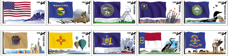 | Apr. 16–44¢ Flags of Our Nation Set 4 coil of 50: Montana, Nebraska, Nevada, New Hampshire, New Jersey, New Mexico, New York, North Carolina, North Dakota and U.S. flag design “Purple Mountain Majesties” (from “God Bless America”). FDCs to Flags of Our Nation Stamp Set 4, Postmaster, 421 Eighth Ave., Rm. 2029B, New York, NY 10199-9998. FDC deadline June 16. (Apr. 9, p. 10) | |