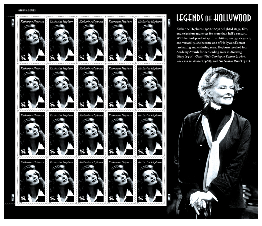 | May 12–44¢ Legends of Hollywood: Katharine Hepburn pane of 20, Old Saybrook, CT 06475. FDCs to Katharine Hepburn Stamp, Postmaster, 36 Main Street, Old Saybrook, CT 06475-9998. FDC deadline July 12. (May 7, p. 12) | |