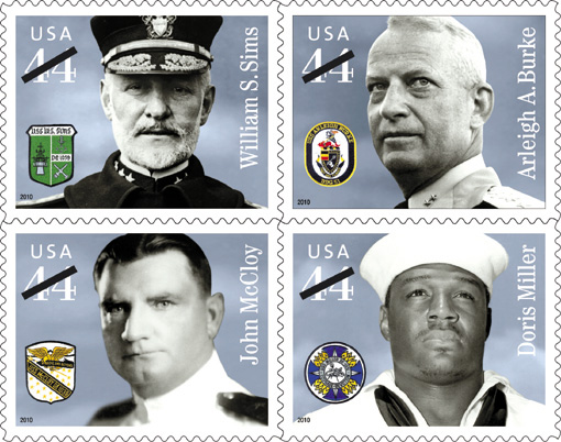 | Feb. 4, Sc. 4440-43–44¢ Distinguished Sailors Distinguished Sailors, in Sc. # order: Admiral William S. Sims, Admiral Arleigh A. Burke, Lt. Commander John McCloy, Petty Officer 3rd Class Doris Miller pane of 20; block or horiz. strip of 4, Sc. 4443a. Washington, DC 20090. (Dec. 4, 2009, p. 10) | |