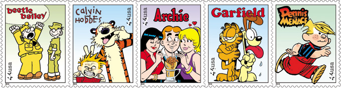 | July 16–44¢ Sunday Funnies: Dennis the Menace, Calvin and Hobbes, Archie, with Betty and Veronica, Garfield the cat with dog Odie, Beetle Bailey, and Sarge, pane of 20, Columbus, OH 43216. | |