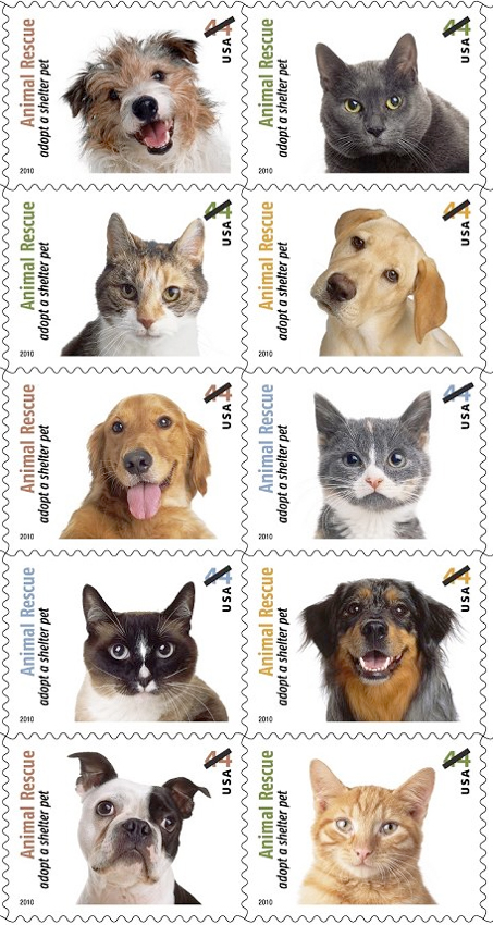 | Apr. 30, Sc. 4451-4460–44¢ Animal Rescue “Adopt a Shelter Pet” Social Awareness set, five diff. cats and five diff. dogs, pane of 20. FDCs to Animal Rescue: Adopt a Shelter Pet Stamps, c/o Postmaster, 7035 Laurel Canyon Blvd., Hollywood, CA 91605-9998. FDC deadline June 30. (Apr. 23, p. 10) | |