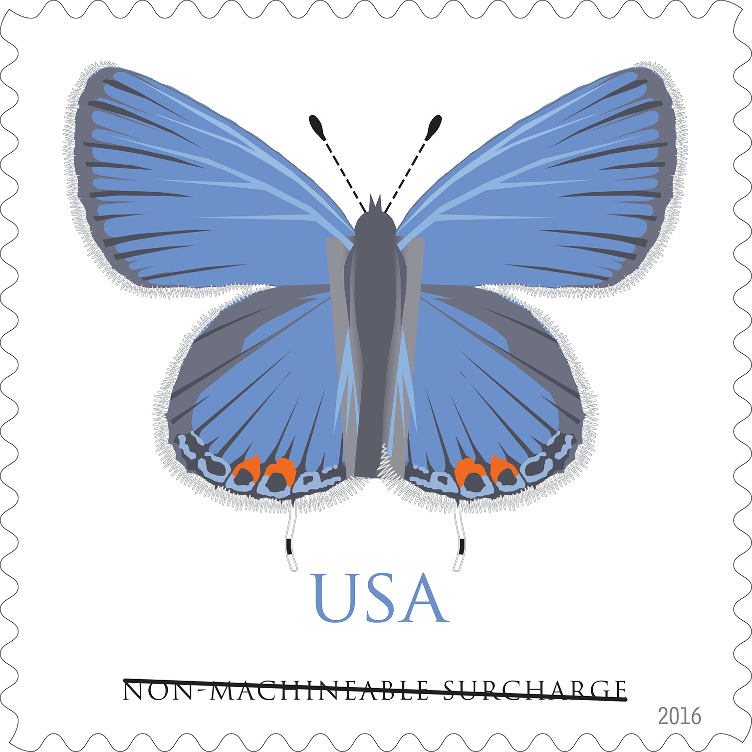 Butterfly "Non-Machineable Surcharge" Stamp This "Non-Machineable Surcharge" stamp is intended for use on irregularly sized envelopes, such as square greeting cards, invitations and announcements, even if they weigh less than one ounce. The stamp was developed in collaboration with the greeting card industry specifically for oversized or square envelopes. These envelopes cannot pass through the automated Postal Service processing system and have to be hand-cancelled. Like a Forever stamp, this issue will always be valid for the rate printed on it, 68¢ at the time of issue. The design is a highly stylized, simplified image of a male Eastern Tailed-Blue butterfly, rather than an exact replica. It is named for the iridescent blue color of its upper wing surface and for the short, thread-like tail on each hind wing. Each year sees two or more generations, the first being the most colorful.