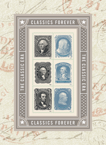 Classics Reproductions Issued in celebration of the long history of U.S. postage stamps, this souvenir sheet features new versions of six of America's earliest stamps, re-issued as Forever stamps to make them easily distinguishable from the mid-19th-century originals. The selvage is composed of cancellations and script from envelopes contemporaneous with the stamps on a buff-colored background with a textured look intended to evoke stationery of the period. The inner border is meant to be reminiscent of a star-spangled patriotic bunting. The great news for used stamp collectors is that these are the first U.S. pressure sensitive adhesive stamps on which the gum is water soluble so that they can be soaked and saved in the same manner as water-activated gum stamps. Continue reading "Early Classics Stage a Comeback" [PDF Document] |
