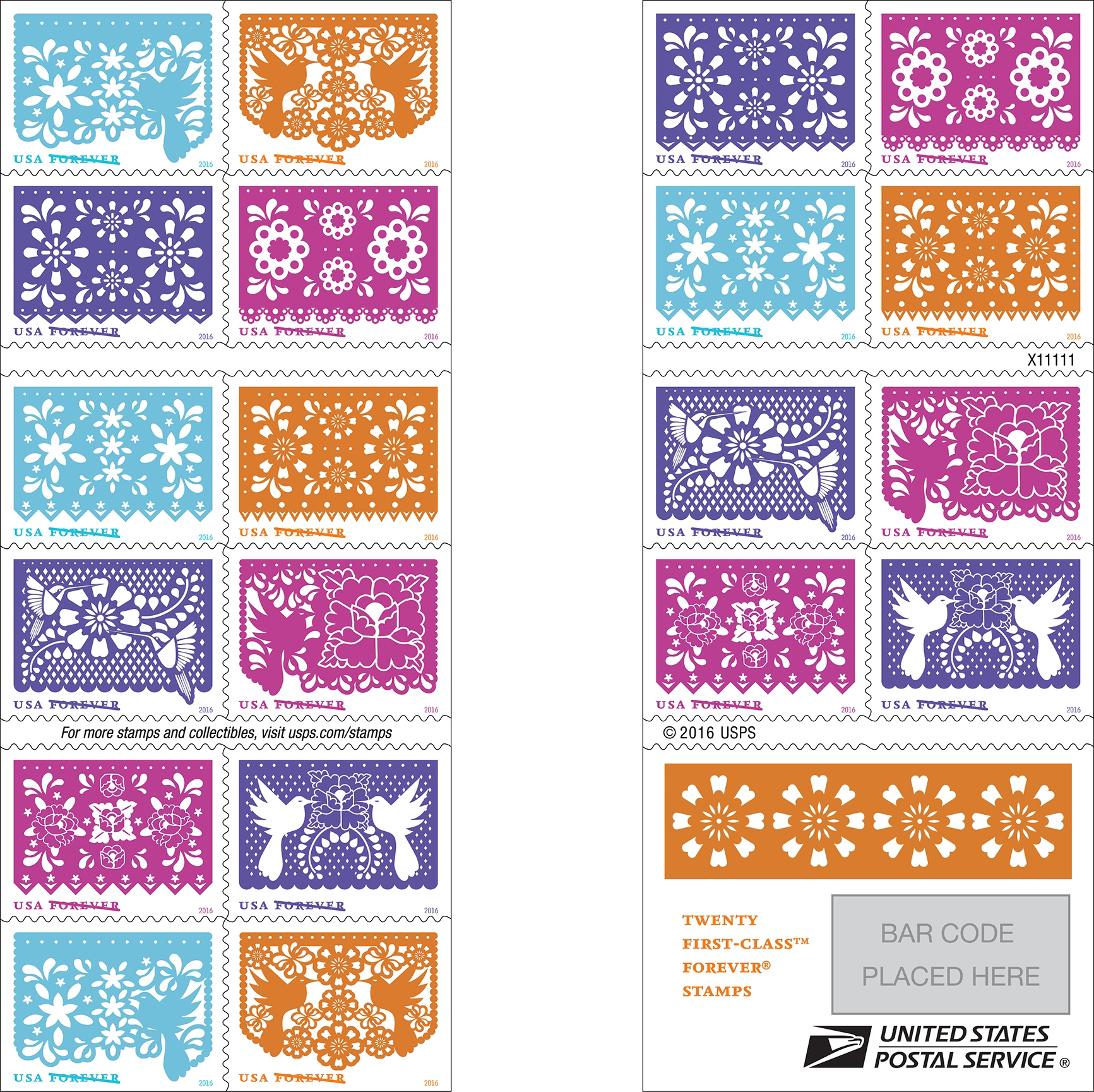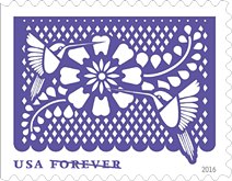 Colorful Celebrations This double sided booklet of 20 stamps contains 10 different designs that are meant to be reminiscent of the Mexican craft of "papel picado." This translates to "pierced paper," although the stamps themselves do not have the paper pierced. According to the Postal People, the intricate designs on the stamps, which show birds, flowers and symbols, "do not strictly follow the thematic traditions of the Mexican art form, but instead are whimsical, colorful vignettes in the style of" papel picado. This art style is used for many festivities by Mexican-Americans, and it is expected that other mailers will want to use these stamps for any festive occasion. |