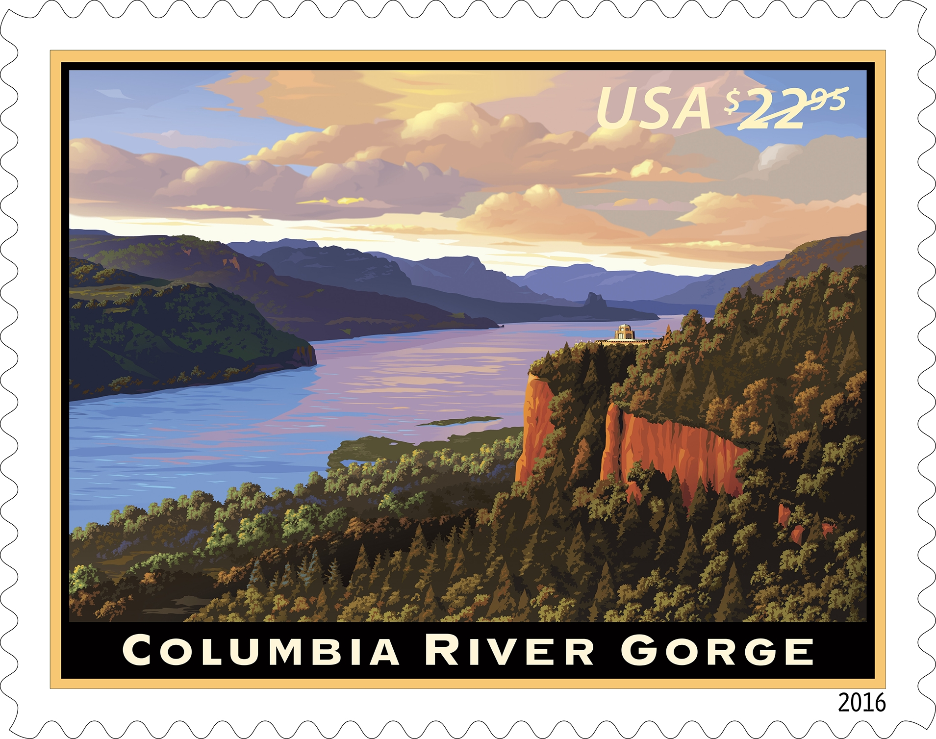 Columbia River Gorge Express Stamp This new Priority Mail Express stamp depicts the grandeur of the Columbia River Gorge. Approximately 80 miles long and up to 4,000 feet deep, the gorge runs along the Columbia River, which forms part of the border between Oregon and Washington. The stamp art captures the beauty of the Columbia River as it winds its way through the steep cliffs of the Cascade Mountain Range. The historic Vista House, sits atop Crown Point, overlooking the river 725 feet below, seen on the stamp in the setting sun. |