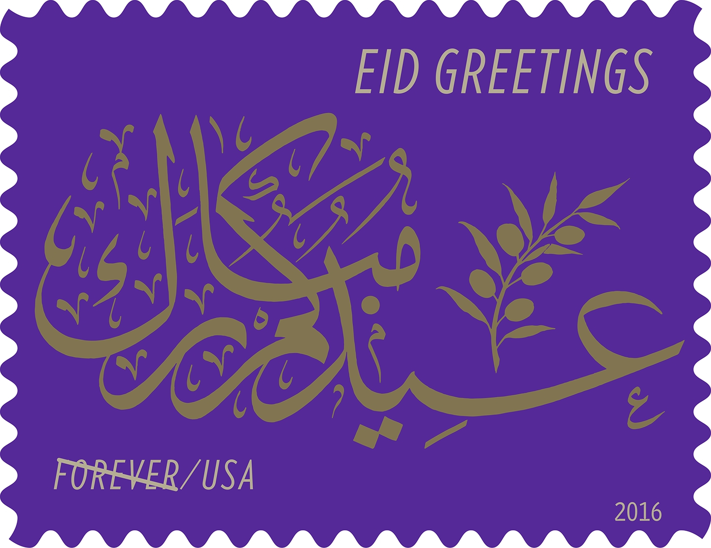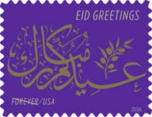 Eid Holiday Greetings Forever Stamp This stamp commemorates the two most important festivals—or eids—in the Islamic calendar: Eid al-Fitr and Eid al-Adha. The gold-colored calligraphy on the stamp was created by world-renowned calligrapher Mohamed Zakariya. It reads Eidukum mubarak, "May your Eid be bountiful (or blessed)." The calligraphy on previous Eid stamps issued by the USPS read Eid mubarak, "may the religious holiday be blessed." To the right of the script, a stylized olive branch rendered in gold carries connotations of abundance, family, hospitality, and peace. |