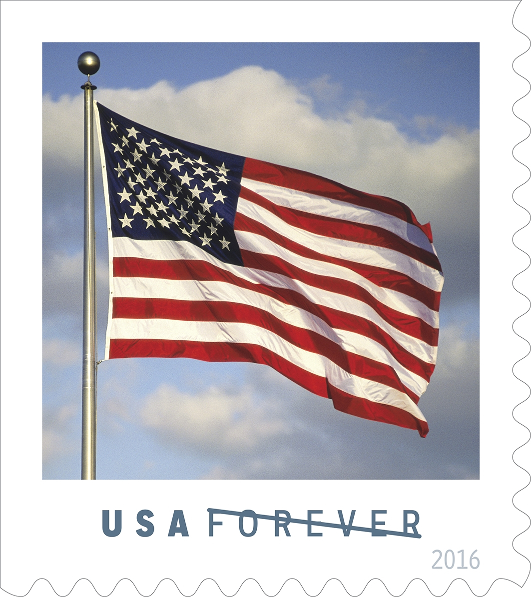 U.S. Flag Forever Stamp The American flag has long symbolized the strength and spirit of the United States, and many Americans like to use these stamps on their outgoing mail and see them on incoming mail. The Postal Service, therefore, always tries to have Flag stamps available to individual and volume mailers. This latest U.S. Flag First-Class Mail Forever stamp features a detail of a photograph of a flag waving against the background of a blue sky. |