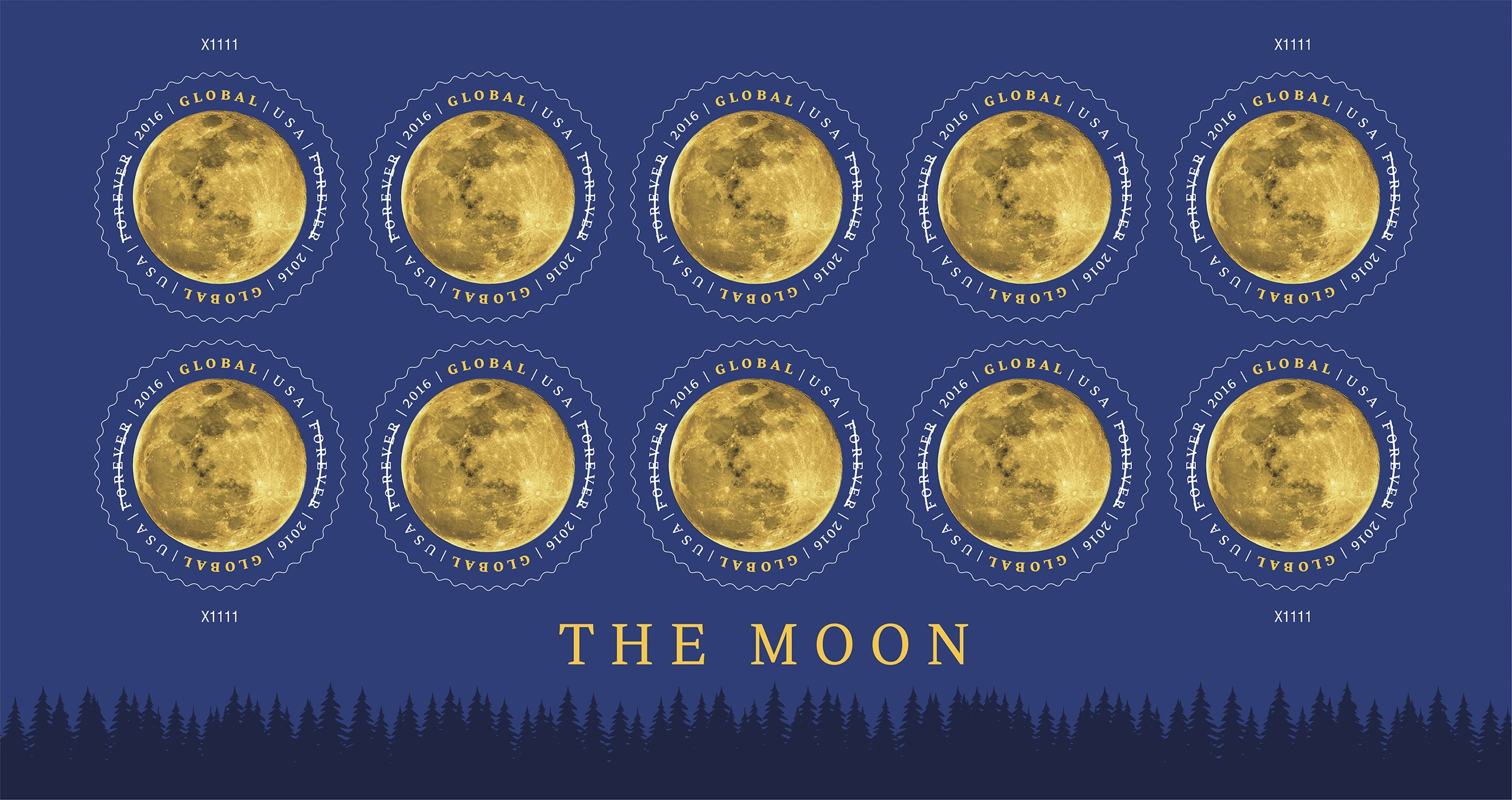 The Moon Global Forever Stamp This round stamp features a detailed photograph of a full moon as it rose over Fort Lauderdale, Florida. Issued at the $1.20 price, the stamp can be used to mail a one-ounce letter to any country to which First-Class Mail International service is available. The moon, the Earth's only natural satellite. has long had considerable impact on mankind. Its gravitational pull creates ocean tides and affects our planet's motions. A full moon occurs approximately every 29.5 days when the moon is opposite the sun, with Earth between the two. Since the rotation and orbit periods of the moon are the same, the same part of the moon is always seen from Earth. |