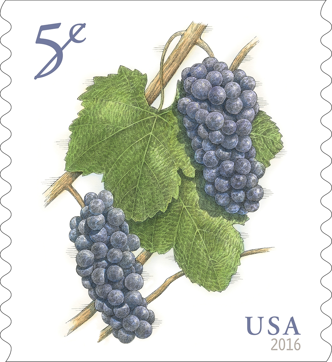 Grapes - 5-Cent Stamp This new five-cent definitive stamp features two clusters of deep-purple Pinot noir grapes growing on vines among several green leaves. Identified as a French wine grape, it is now grown in other regions including Oregon and California in the United States. Translated from the French, "pinot" is "pine", for the pine-cone shaped clusters in which the grapes grow, and "noir" is "black". John Burgoyne of Barnstable, Mass. designed the Grapes stamp. |
