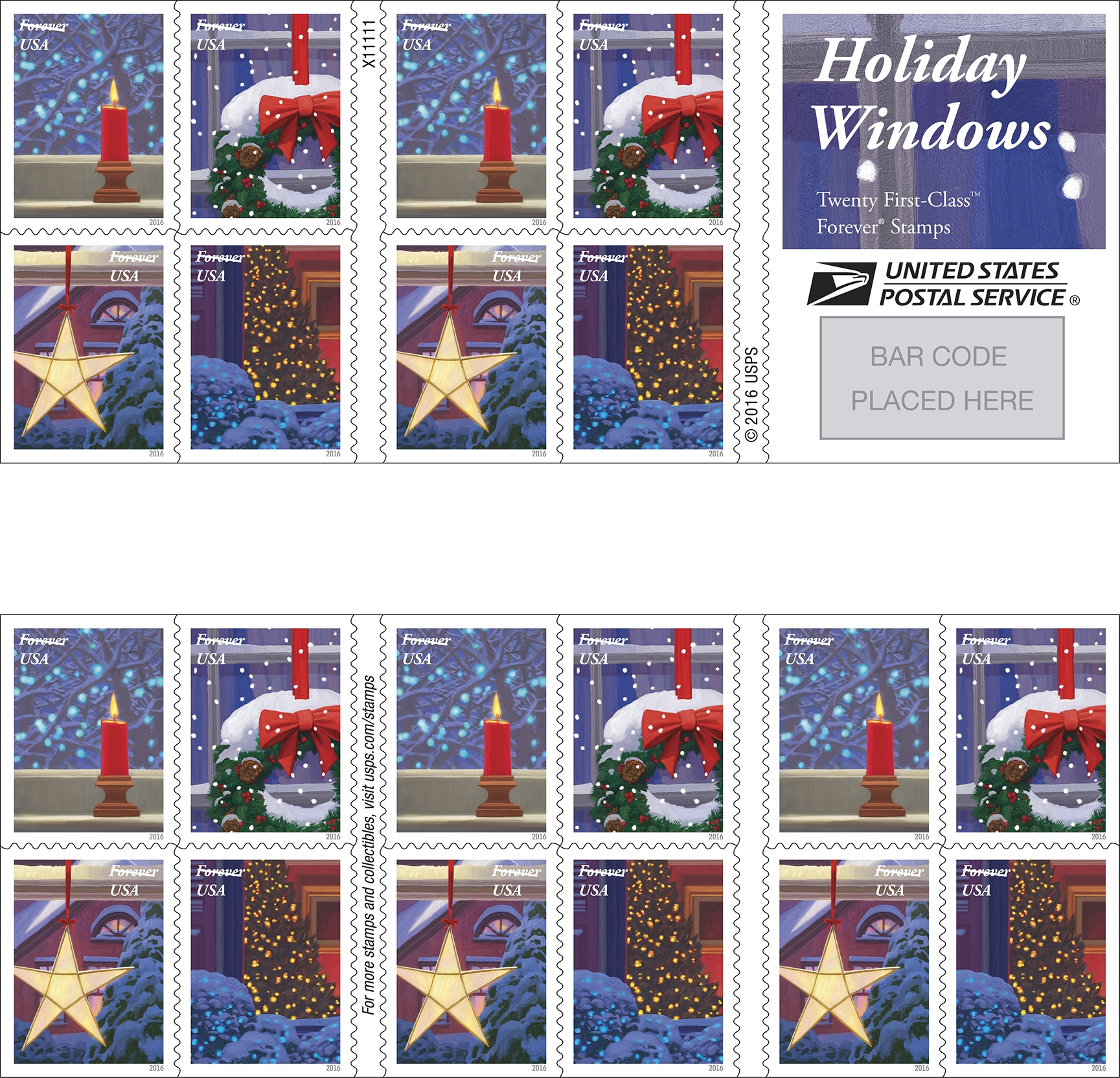 Holiday Windows Forever Stamps The 2016 contemporary holiday stamps will highlight the role windows play during the holidays. Portraying four “windows on the holiday world,” the stamps are intended to add a dash of winter bliss to letters and cards during the year's coldest months. Two of the designs show views from the inside looking out: a single burning candle sits on a sill and a simple star ornament hangs from a hook attached to the window sash, out of sight. Two other designs show views from the outside looking in: a brightly lit Christmas tree contrasts with the snowy shrubs on the other side of the glass and a snow-covered wreath hangs in front of frosted window panes. |