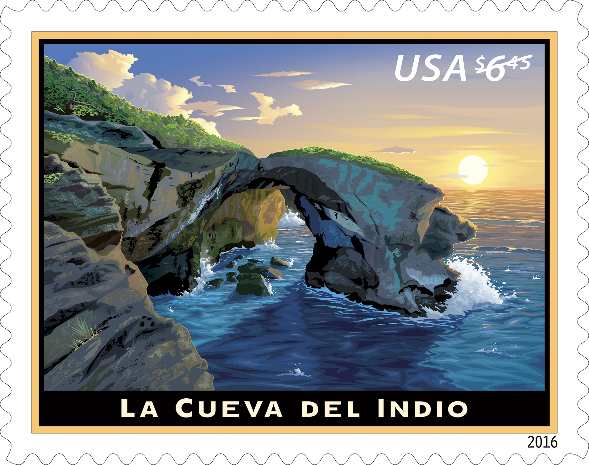 La Cueva del Indio Priority Mail Stamp This new Priority Mail stamp features one of Puerto Rico's many magical and mysterious caves. The stamp art depicts a sunset view of La Cueva del Indio, or the Cave of the Indian, which is located near Arecibo on Puerto Rico's north coast. The cave gets its name from the great number of engravings, known as petroglyphs, found on its walls. A $6.45 Priority Mail Envelope with the same design also was issued January 17 in Washington, D.C. |