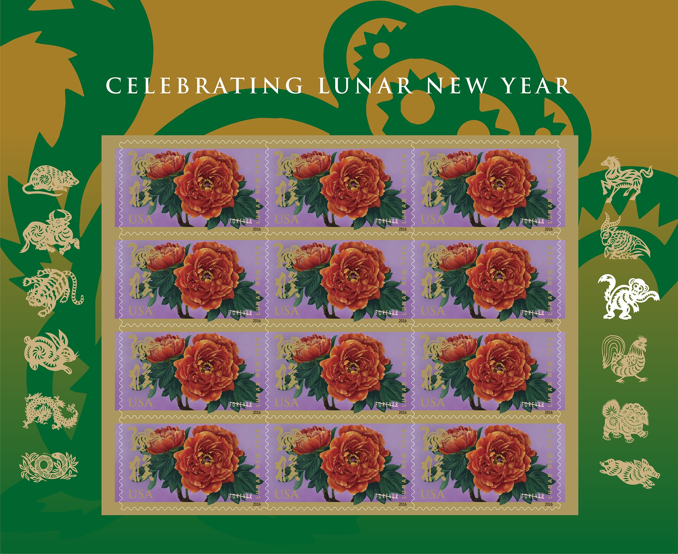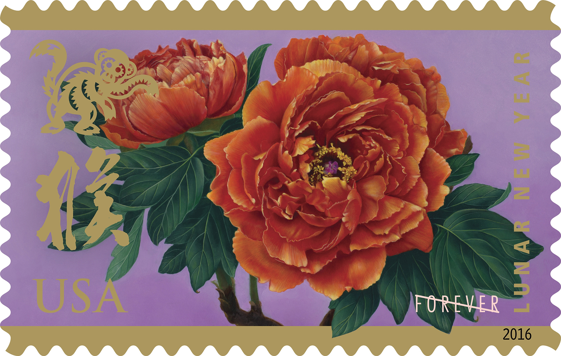 Year of the Monkey - Lunar New Year Forever Stamp New York artist Kim Mak once again brings us a design that features a traditional form of Lunar New Year celebration. The stamp art features two bright reddish-orange peonies against a purple background. Peonies symbolize wealth and honor in Chinese culture and often decorate the sides of the traditional drums played during the holiday festivities. The stamp design incorporates two elements from the previous series of Lunar New Year stamps: the intricate cut-paper design of a monkey and the Chinese character for "monkey," drawn in grass-style calligraphy. |