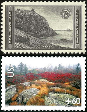 Acadia National Park, Bar Harbor, Maine The Acadia stamp depicts the Bass Harbor Head Light. People have been drawn to the rugged coast of Maine throughout history. Awed by its beauty and diversity, early 20th-century visionaries donated the land that became Acadia National Park. The park is home to many plants and animals, and Cadillac Mountain, the tallest mountain on the U.S. Atlantic coast. Today visitors go to Acadia to hike granite peaks, bike historic carriage roads, or relax and enjoy the scenery. Acadia National Park was featured on the 7¢ stamp in the 1934 National Parks set and on a 2001 Scenic American Landscapes 60¢ Airmail stamp. Click to see previous issues of Acadia National Park. |