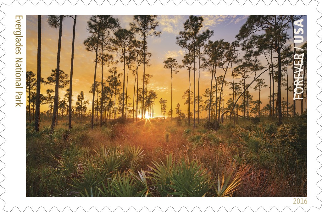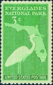 Everglades National Park, Florida Spanning the south Florida peninsula from Miami to Naples and south to the Florida Keys, Everglades National Park's 1.5 million acres of sawgrass prairies, tropical hardwood hammocks, pine rocklands, mangrove forests and marine and estuarine waters provide habitat for a wildlife spectacle like no other. Crocodiles, alligators, manatees, flamingos, herons and turtles are just a small sampling of wildlife that can be seen there. The park was established in 1934 to protect the vanishing Everglades from the inroads of new homes and businesses across south Florida. It was dedicated as a National Park in December 1947, the first such Park to be established to protect an ecosystem, as opposed to geographic features. Click here to see the 1947 Dedication of Everglades National Park stamp. |