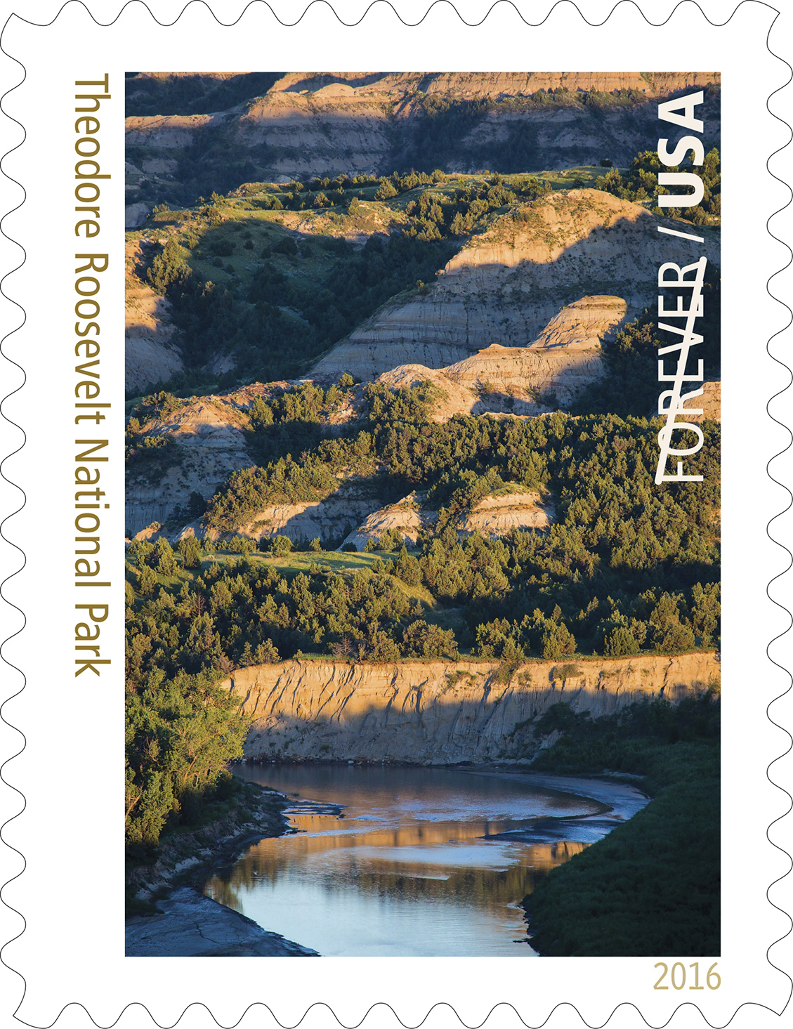 Theodore Roosevelt National Park, North Dakota According to the National Park Service, when Theodore Roosevelt came to Dakota Territory to hunt bison in 1883, the rugged landscape and strenuous life he experienced there would help shape a conservation policy from which we still benefit today. Theodore Roosevelt National Park contains several sites of historical significance, each relating to the era of cattle ranching in the late 1800s. Most significant is Theodore Roosevelt's Elkhorn Ranch site, where he spent the bulk of his time and where he developed many of his conservation ideas. Following Roosevelt's death in 1919, the Little Missouri Badlands were explored to determine possible park sites. During the Depression, Civilian Conservation Corps camps were established in both of the future park units, and they developed roads and other structures in use today. In 1946 the area was transferred to the United States Fish and Wildlife Service as the Theodore Roosevelt National Wildlife Refuge, and in 1947 President Truman established the Theodore Roosevelt National Memorial Park. A photograph of the Little Missouri River winding through the Badlands of North Dakota is featured on the stamp. The Little Missouri River flows through all three units of the 110-square-mile park, and the Maah Daah Hey Trail connects all three units. The park is home to a wide variety of Great Plains wildlife including bison, mountain lion, feral horses, elk, bighorn sheep, white-tailed deer and mule deer, prairie dogs, and at least 186 species of birds including golden eagles, sharp-tailed grouse, and wild turkeys. The entire park has been surrounded with a 7-foot tall woven wire fence to keep bison and feral horses inside the park and commercial livestock out. Other animals are able to pass over, under, or through the fence in specific locations provided for that purpose. |