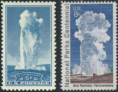 Yellowstone National Park, ID, MT and WY A photograph of two bison silhouetted in Yellowstone National Park's winter morning sun is used for the Yellowstone stamp in the set of 16 National Wildlife Service Centennial set. Yellowstone, believed to be the first National Park in the world, was established on March 1, 1872. Covering almost 3,500 square miles, Yellowstone contains canyons, rivers, mountain ranges and lakes, including Yellowstone Lake, one of the largest high-elevation lakes in North America. The park is home to hundreds of species of mammals, birds, fish, reptiles and plant life. Grizzly bears, wolves, and free-ranging herds of bison and elk live in the park. The Park is located over the largest supervolcano on the continent, a feature that has resulted in half of the world's geothermal features being located in Yellowstone. One of these features is its Old Faithful geyser, which has been featured on two United States stamps. Click here to see the 1934 National Parks stamp and the 1972 stamp celebrating the Centennial of Yellowstone as the first National Park. |