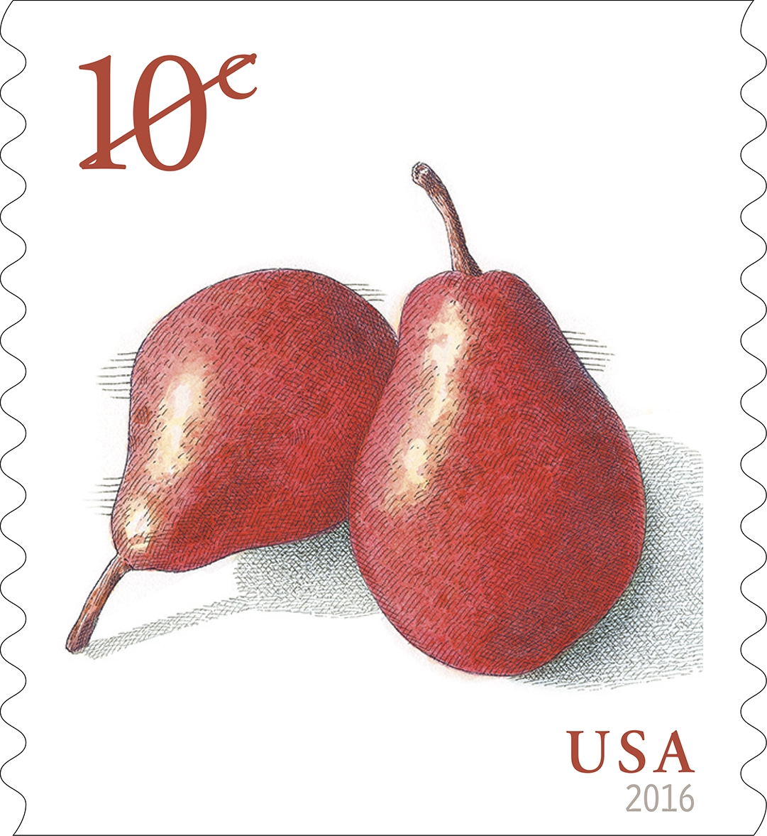Pears - 10-Cent Stamp This new ten-cent definitive stamp features two red pears on a white background. The two most common red pears grown in the United States are the red Anjou, similar to green Anjous in all respects other than color; and red Bartlett pears, referred to as "Summer Pears" for the time of year in which they are harvested. John Burgoyne of Barnstable, Mass. designed the Pears stamp. |