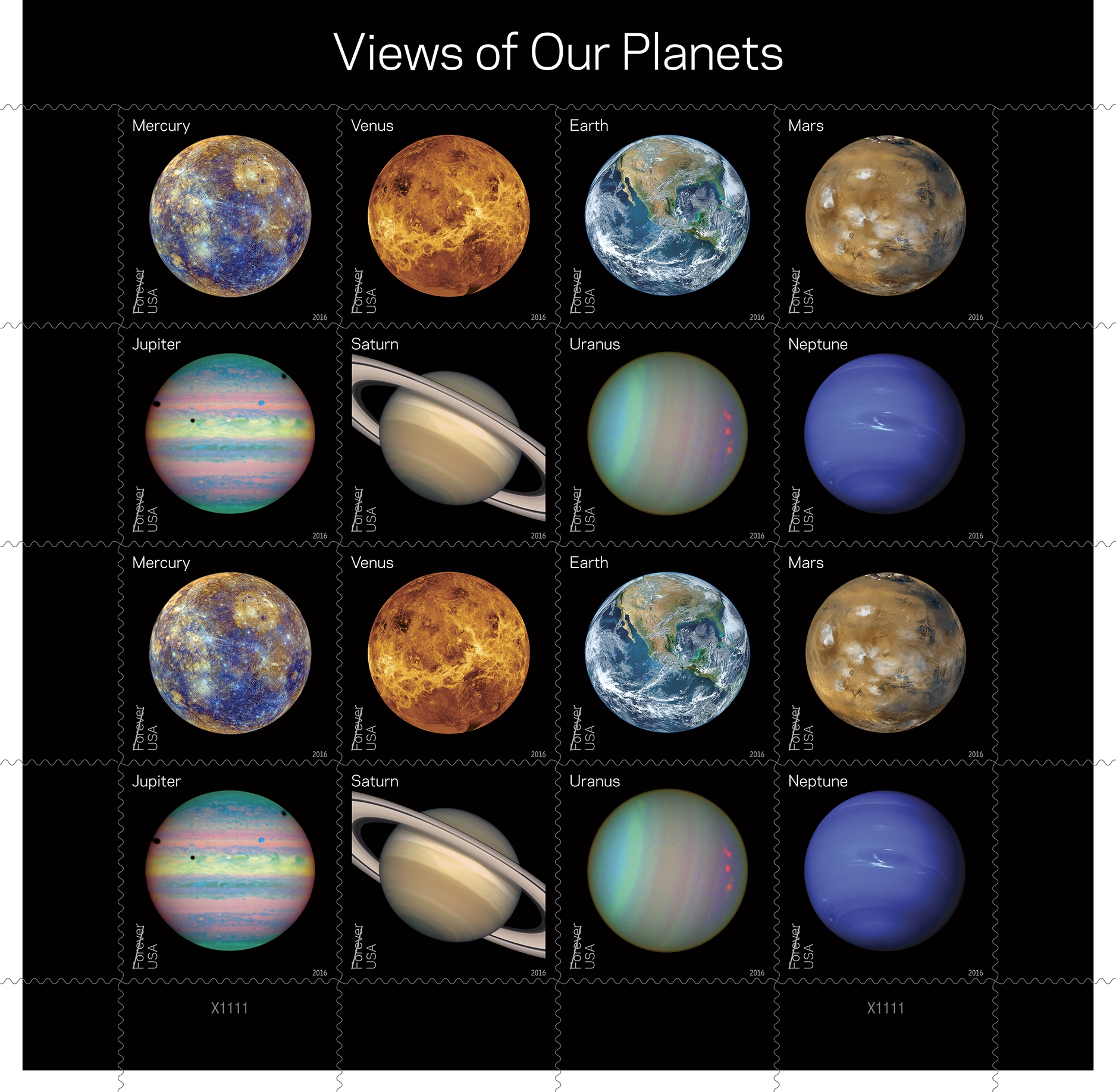 Views of Our Planets This issue showcases some of the more visually compelling full-disk images of the planets obtained during this era of space exploration. All eight planets are shown; Pluto, no longer a "planet". is not. Some stamps show the planet's "true" color—what we might see with our own eyes if traveling through space. Others use colors to represent and visualize certain features of a planet based on imaging data. Still others use the near-infrared spectrum to show things that cannot be seen by the human eye in visible light. The verso text explains the images and identifies the spacecrafts and telescopes that helped obtain them. |