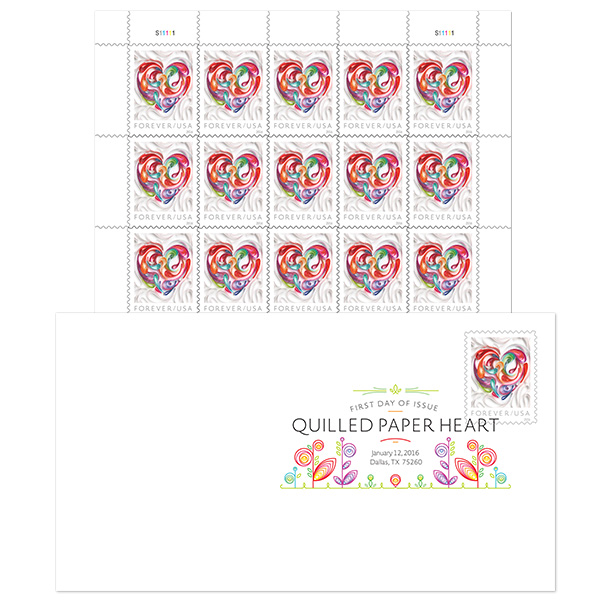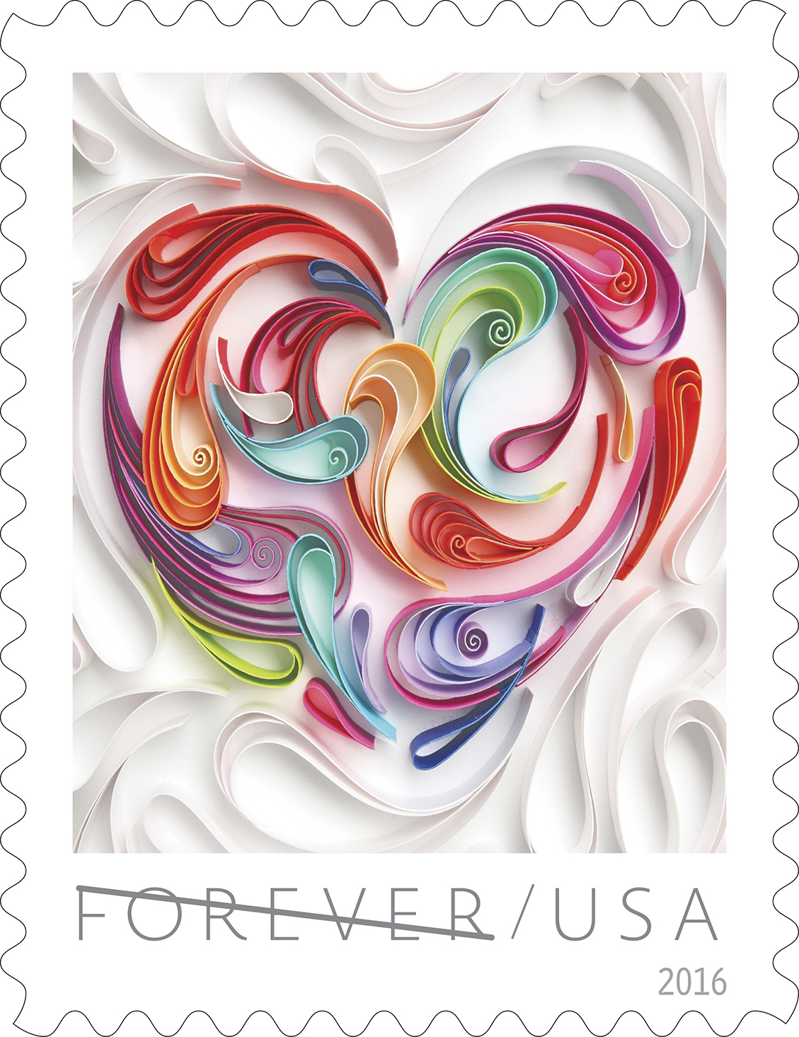 Quilled Paper Heart - Love Forever Stamp The stamp features a heart that was created using the ancient art of quilling. Quilling involves rolling and shaping narrow strips of paper, laying them on their edges, and gluing them in place to form intricate designs. The heart shape in the center of the stamp art is made from paper strips of many colors and is surrounded by white paper swirls on a white background. Click for article: Quilling Art on 2016 Love Stamp |