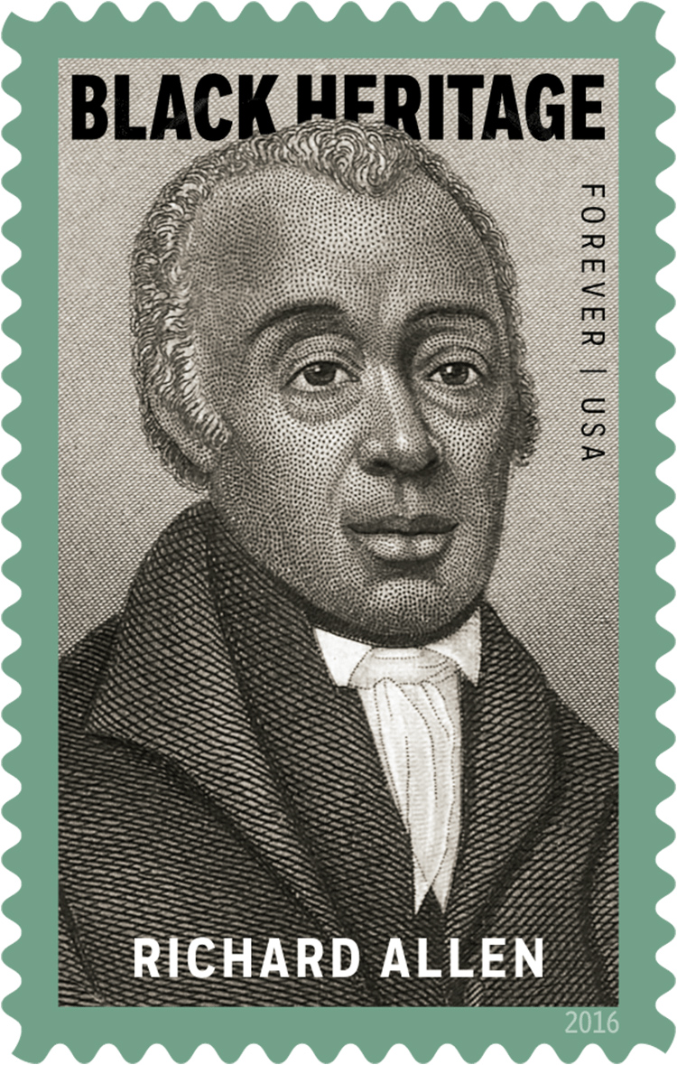 Richard Allen - Black Heritage Forever Stamp Born February 14, 1760, Allen was a preacher, activist, and civic leader. This stamp coincides with the 200th anniversary of Allen's founding of the African Methodist Episcopal Church, one of the most important institutions in African-American life, and his election as its first bishop. The stamp art is a portrait of Allen, a detail from an 1876 print titled "Bishops of the A.M.E. Church." Featuring Allen in the center surrounded by ten other bishops and six historical vignettes, the full print is from the collection of the Library Company of Philadelphia. The stamp will be issued at the Mother Bethel A.M.E. Church. Click for article: Church Founder Richard Allen Honored