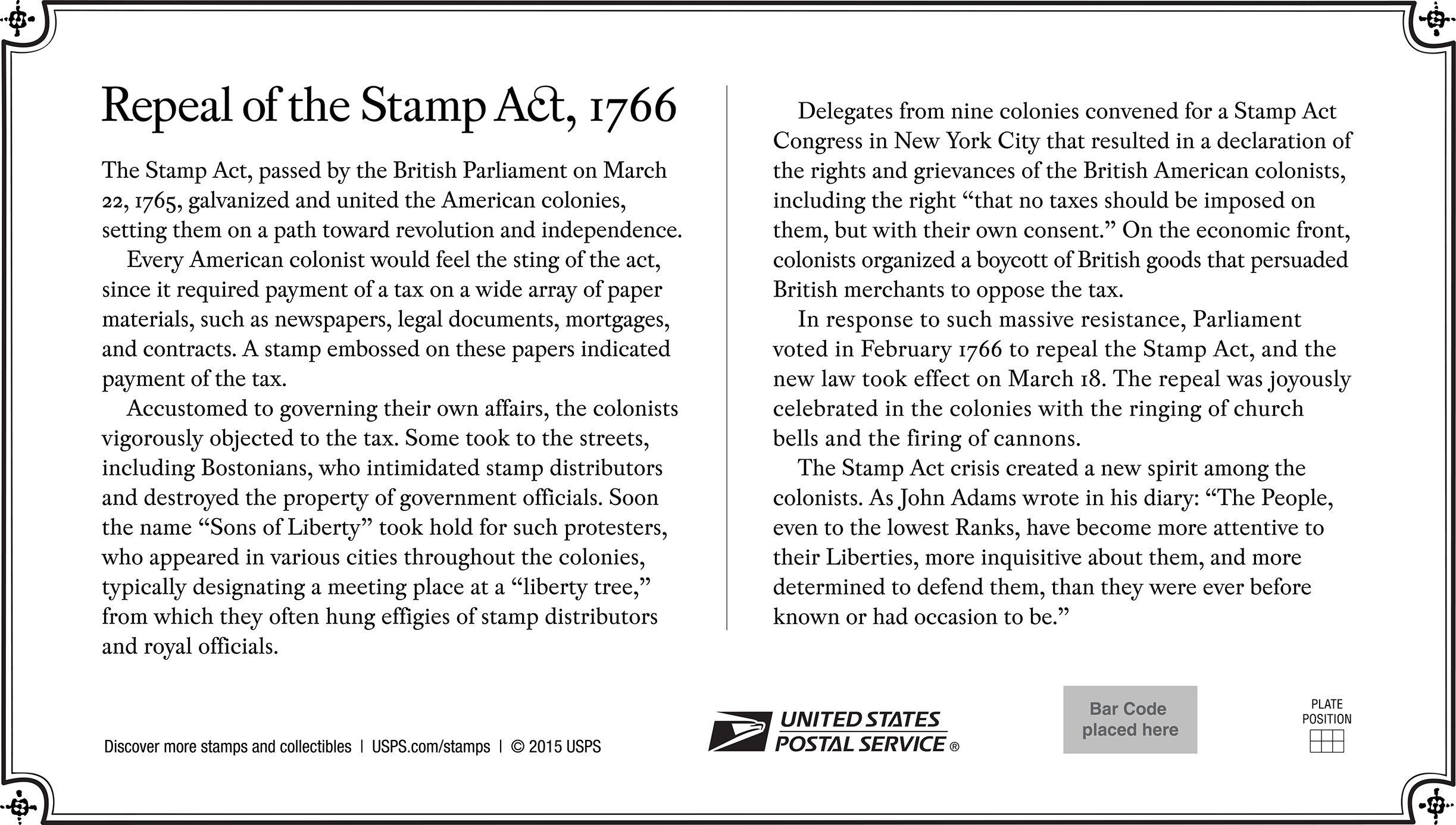 Repeal of the Stamp Act, 1766 Forever Stamp This issue commemorates the 250th anniversary of the repeal of the Stamp Act, British legislation that galvanized and united the American colonies and set them on a path toward revolution. The act required payment of a tax on a wide array of paper materials, such as newspapers, pamphlets, legal documents, licenses, mortgages, contracts, and bills of sale. A stamp would be embossed on these papers to indicate payment. The stamp art depicts a crowd gathered around a "liberty tree" to celebrate the repeal of the Stamp Act. The selvage area displays a proof print of a one-penny revenue stamp and includes a famous slogan from the era: “Taxation without representation is tyranny,” a theme that has once again become popular with some groups of citizens.