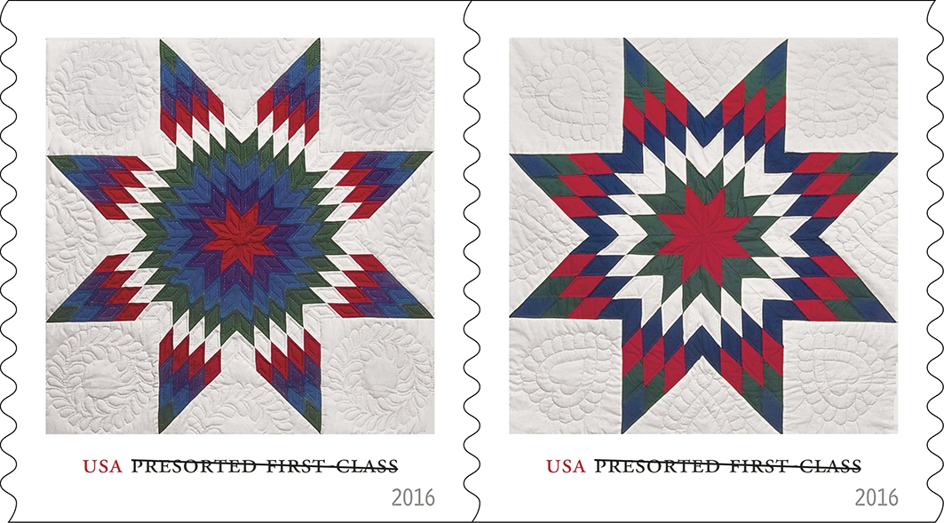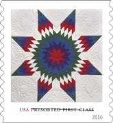 Star Quilts Presorted First-Class Stamp With names like Blazing Star, Touching Stars, and Starburst, stars are one of the most popular design motifs for American quilters. These stamps feature two versions of one of those favorites, the Lone Star pattern. Each stamp shows a detail from a photograph of one of the two quilts highlighting the intricate work involved in creating the star design. The quilt top is created by stitching together many small diamond shaped pieces of fabric. The quilts featured in the stamp art were made by Amish quilt makers. |