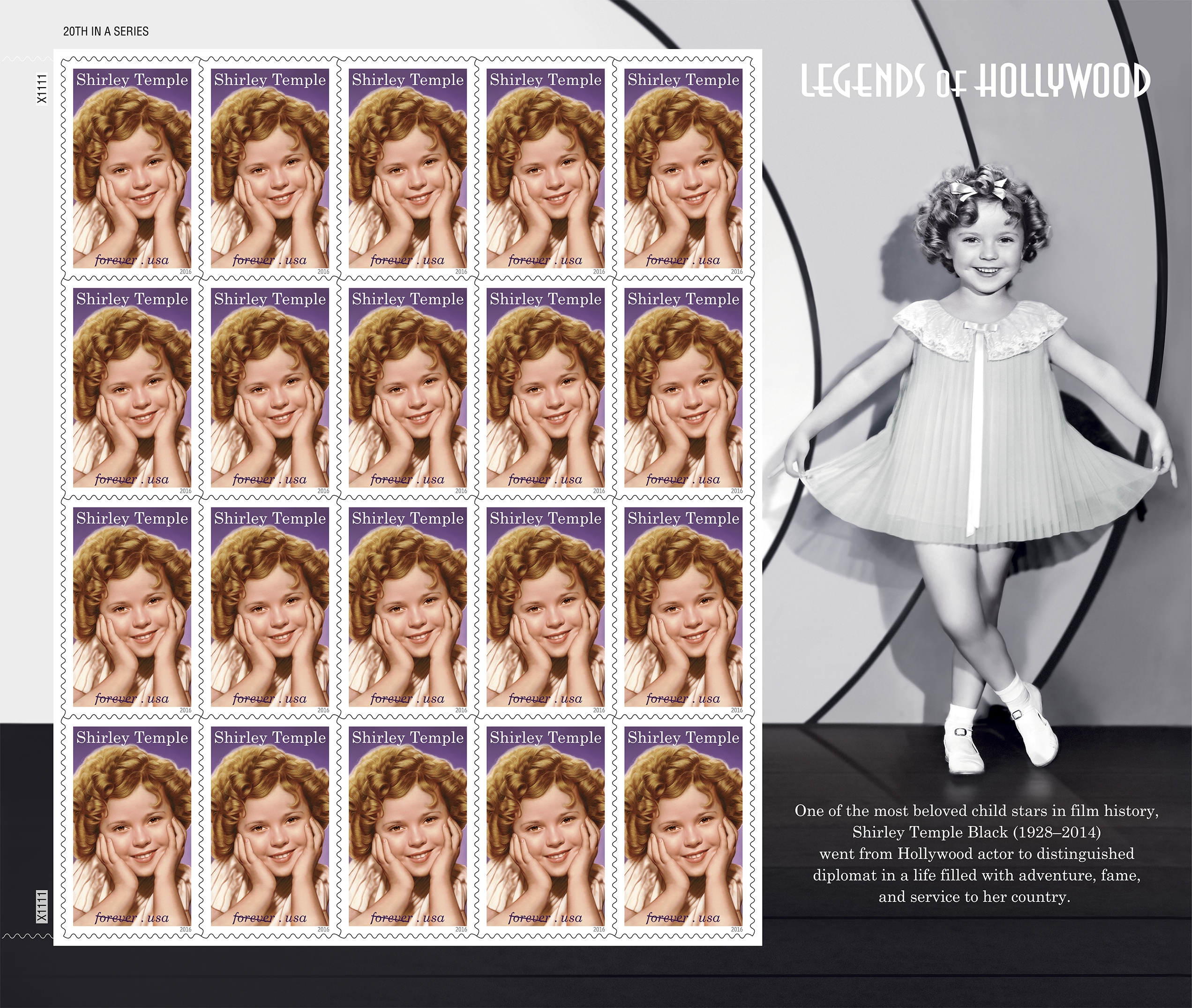 Shirley Temple - Legends of Hollywood Forever Stamp With the 20th stamp in the Legends of Hollywood series, the Postal Service honors actress and diplomat Shirley Temple Black. As a child, Temple was the most famous film star in the world. She began dance lessons when she was just three years old, and by age five she was under contract to Fox Film Corporation. Her song, "On the Good Ship Lollipop," is a classic, and the Shirley Temple doll remains one of the most collectible dolls ever made. As an adult, Black had a distinguished career in diplomacy, serving as a delegate to the United Nations, U.S. Ambassador to Ghana and Czechoslovakia, and U.S. Chief of Protocol. The stamp art features a painting based on a 1935 still image from "Curly Top," one of her iconic movie roles. The selvage features a publicity photo from the 1933 short film "Managed Money". |