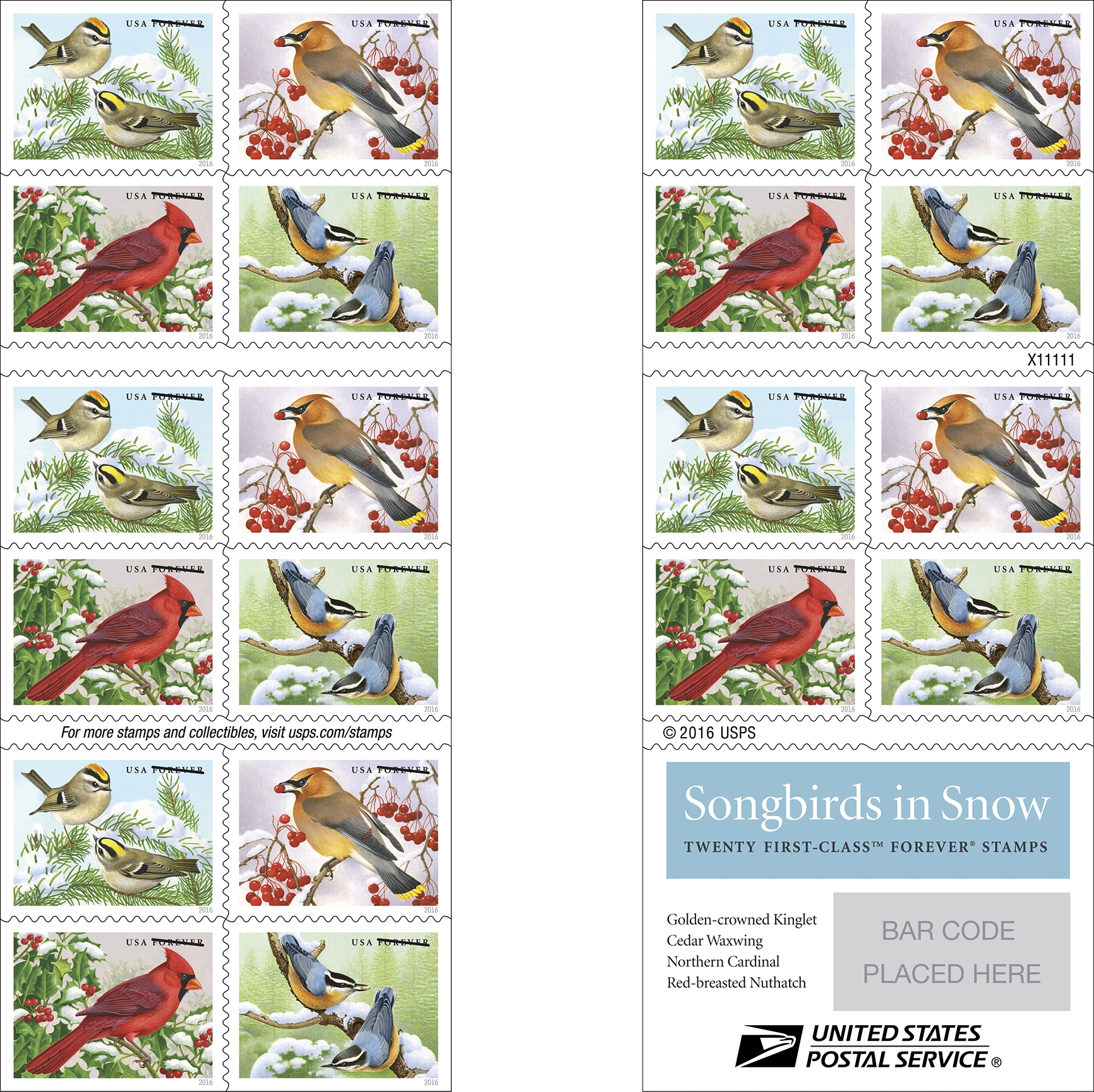 Songbirds in the Snow Forever Stamps Following the many World Stamp Show issues, the USPS apparently ran out of stamps to release at major stamp shows. This will explain the August release of four Songbirds in Snow stamps. The stamps picture the Golden-crowned Kinglet, the Cedar Waxwing, the Red-breasted Nuthatch, and the Northern Cardinal. The Postal People tell us, "The sight of birds sitting on a snowy tree branch and the sound of their songs and calls bring joy in the depth of winter." Though many birds migrate to warmer climes before the snow falls, some hardy birds have ways to cope with the cold. Fluffing their feathers creates an insulating layer of air, and their winter plumage can contain up to 30 percent more feathers than in summer. Many birds are able to slow their metabolism, lower their body temperatures, or even reduce their heart rate to help them conserve energy.