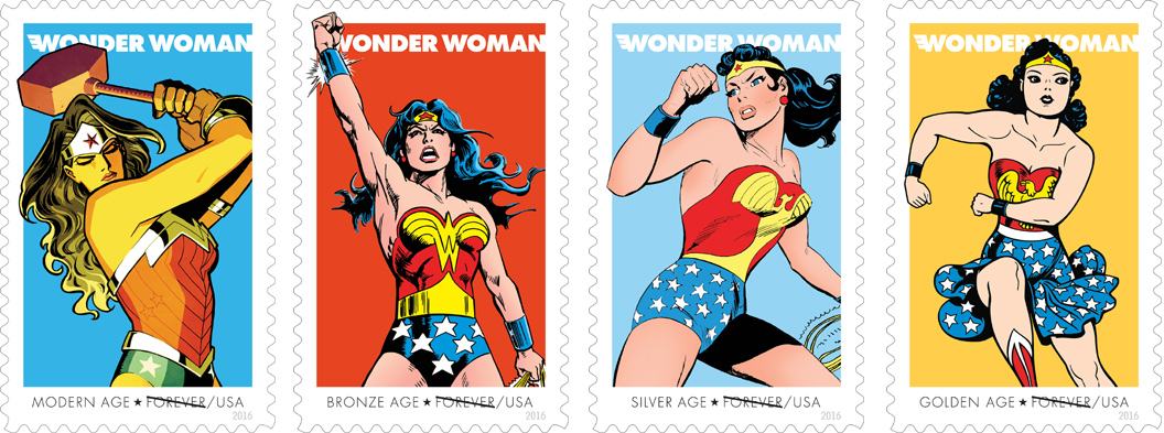 Wonder Woman Forever Stamps First seen in October 1941 to test her appeal at a time when female superheroes were rare, Wonder Woman quickly broke out and headlined her own title by the next year. Subsequent generations came to know her via her hit 1975-79 television series and roles in animated shows and movies, as well as her appearance on the cover of Ms. Magazine #1 in 1972. This past March, Wonder Woman was seen for the first time in a live action motion picture with her introduction in the movie “Batman v Superman: Dawn of Justice.” Now her 75th anniversary is being celebrated on a set of four new stamps that trace her development through four eras: Golden Age (1941–55), Silver Age (1956–72), Bronze Age (1973–86) and Modern Age (1987–present). |