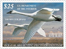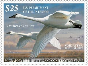 $25 Federal Duck Stamp (not a postage stamp) The 2016-2017 Duck stamp features Joseph Hautman's acrylic painting of a pair of trumpeter swans. This is Hautman's fifth Federal Duck Stamp contest win. The new stamp is valid from July 1, 2016 through June 30, 2017. In addition to being required by waterfowl hunters age 16 and older, it also is popular with conservationists and collectors. Duck stamps are not postage stamps; they are conservation revenue stamps. The Fish and Wildlife Service (FWS) produces the Federal Duck Stamp, which raises about $25 million each year. FWS states that 98 percent of the purchase price goes directly to help acquire and protect wetland habitat and purchase conservation easements for the National Wildlife Refuge System. |