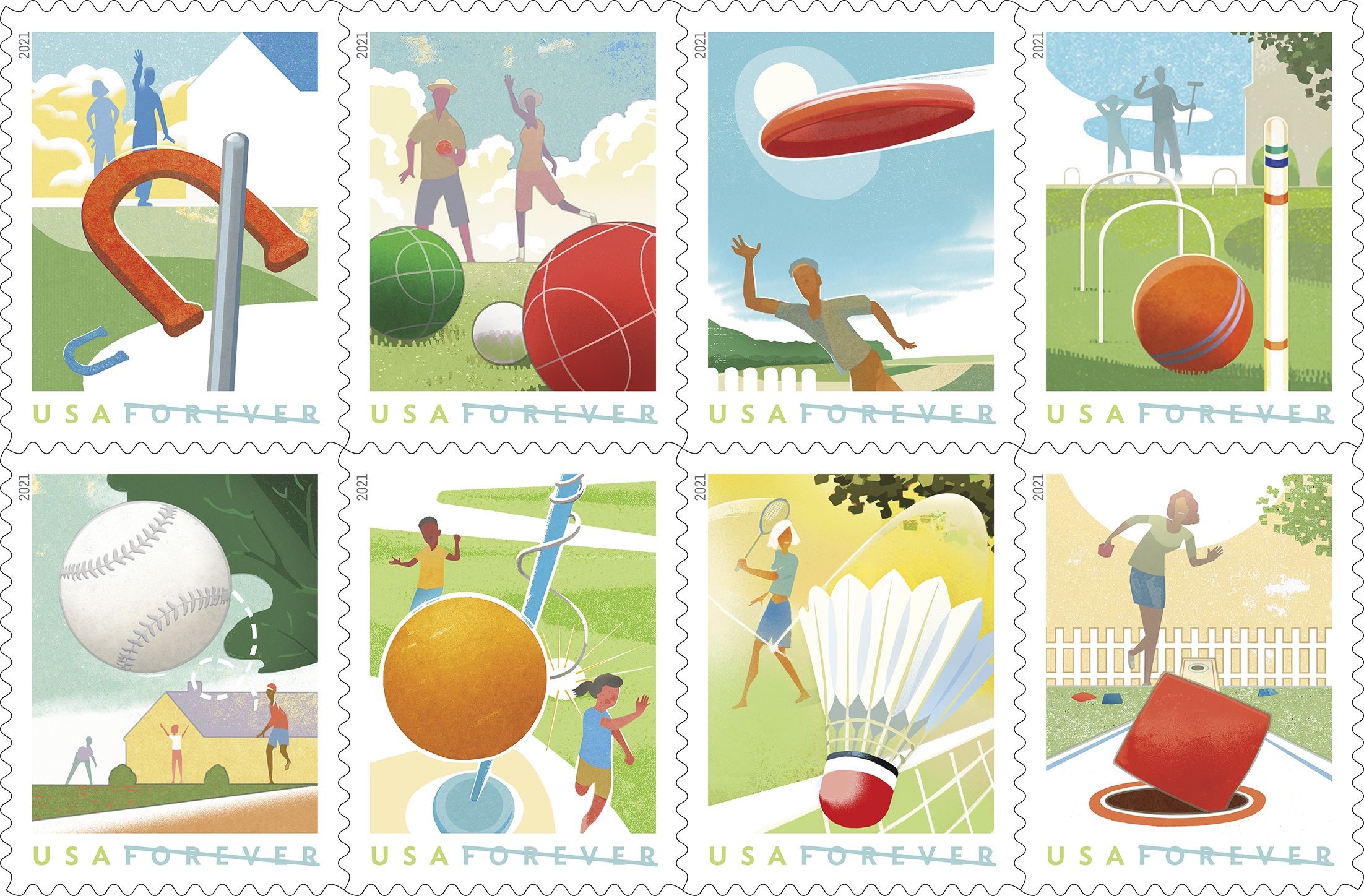 Backyard Games Forever Stamps These stamps capture many of the games Americans play for outdoor fun. A pane of 16 stamps features eight unique designs including: badminton, bocce, cornhole, croquet, flying disc, horseshoes, tetherball and a variation on pick-up baseball. Greg Breeding was the art director. Mike Ryan designed the stamps with original artwork by Mick Wiggins. |