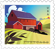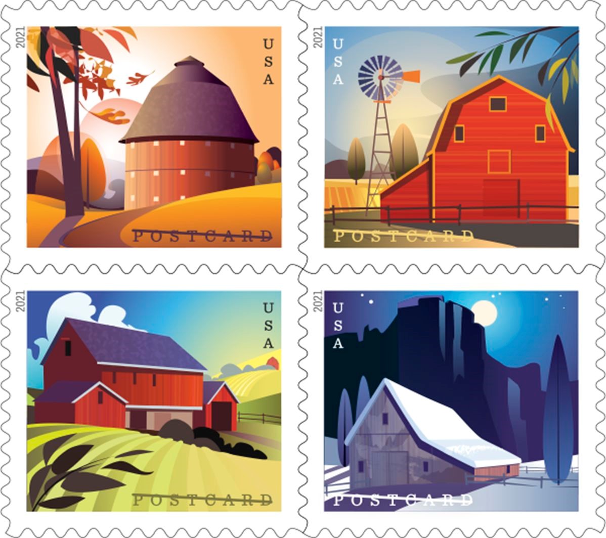 Barns Postcard Rate Stamps Four new postcard stamps celebrate the beauty and history of American barns. With differing qualities of light and color, each piece reflects one of the four seasons: a round barn surrounded by the hazy light and warm colors of fall, a gambrel-roofed barn in summer, a forebay barn in an early spring countryside, and a Western barn on a winter’s night. Ashley Walton designed the stamps with original artwork by Kim Johnson. Greg Breeding was the art director.