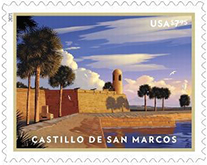Castillo de San Marcos $7.95 Priority Mail Stamp The latest Priority Mail stamp celebrates pictures the Castillo de San Marcos, in St. Augustine, Florida. Built by the Spanish in St. Augustine to defend Florida and the Atlantic trade route, it is the oldest masonry fortification in the continental United States. Construction began in 1672, 107 years after the city's founding by the Spanish when Florida was part of the Spanish Empire. The construction of the core of the current fortress was completed in 1695, and has undergone many alterations and renovations over the centuries. The stamp art features a digital illustration of the fortress based on a contemporary photograph. With a view toward the northeast corner of the fortress, the artwork captures it in the golden glow of sunrise over Matanzas Bay. Art director Greg Breeding designed the stamp with art created by Dan Cosgrove. |