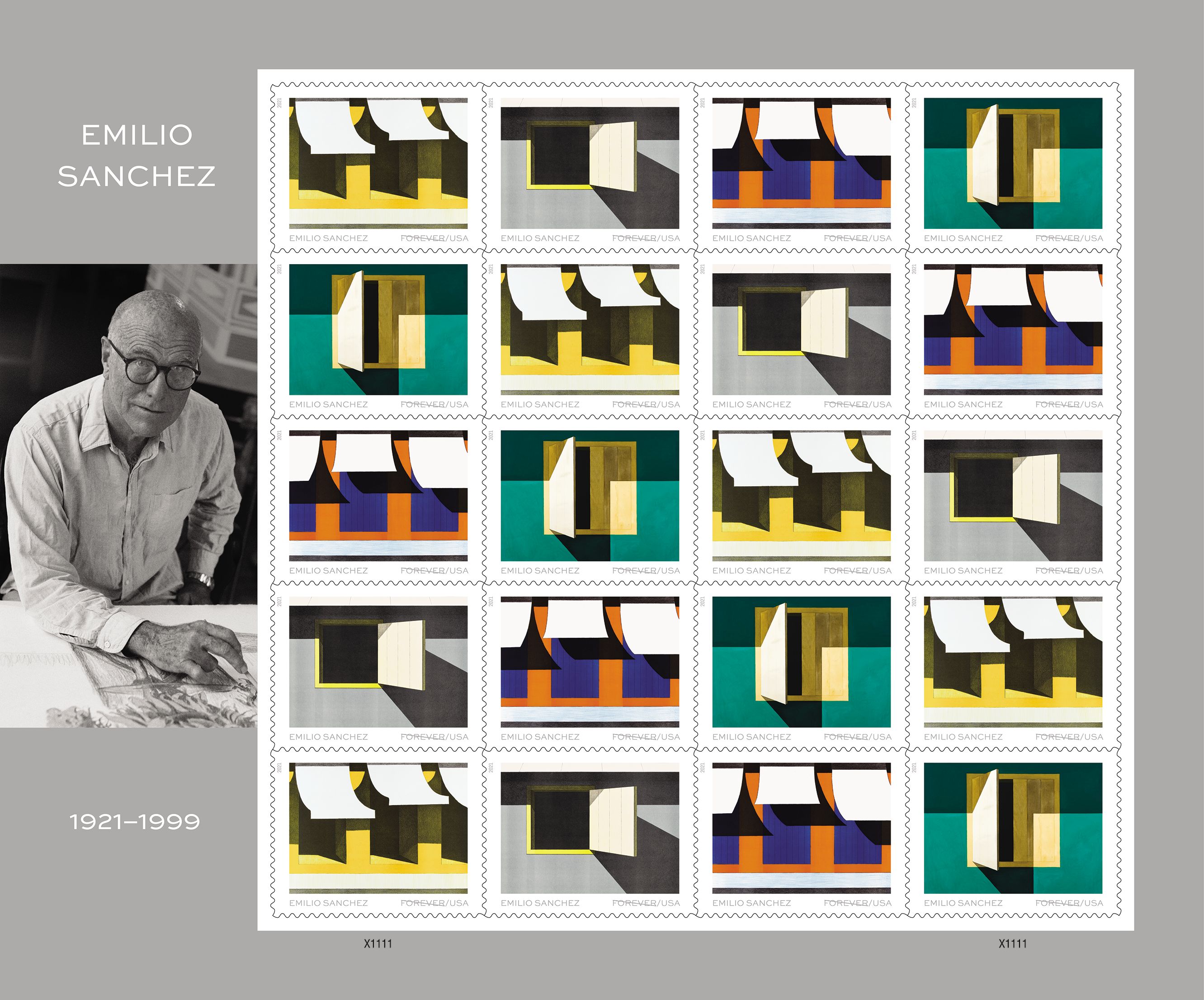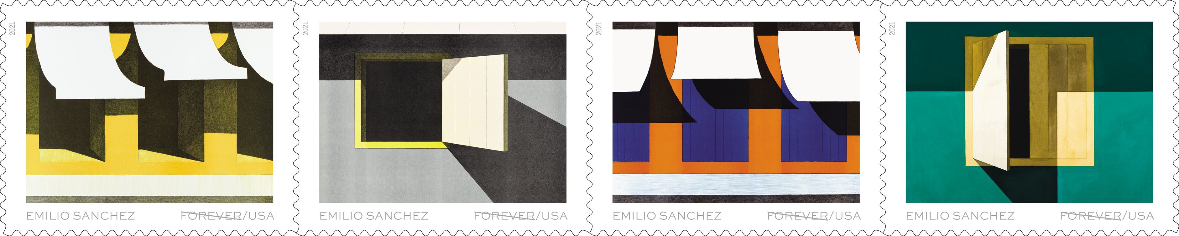 Emilio Sanchez Forever Stamps The art of Emilio Sanchez (1921-1999) is celebrated with four new stamps featuring his colorful architectural lithographs and paintings: “Los Toldos” (1973), “Ty’s Place” (1976), “En el Souk” (1972) and Untitled (Ventanita entreabierta) (1981). Sanchez explored the effects of light and shadow to emphasize the abstract geometry of his subjects. His artwork encompasses his Cuban heritage as well as his long life in New York City. Antonio Alcalá served as art director and designer for this pane of 20 stamps. Beyond the four similar pieces selected by the Postal Service, Sanchez’ explored other themes, from detailed stained glass windows to abstracted storefronts or city skylines. His art can be seen in museums from the Bronx Art Museum to the Smithsonian American Art Museum. |